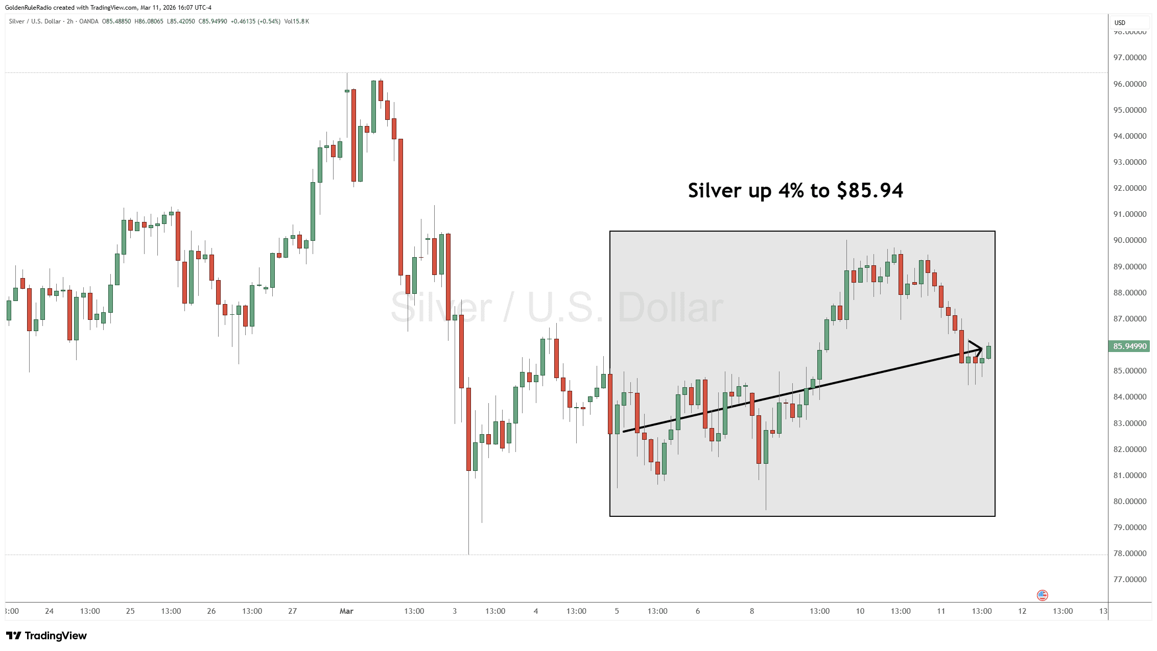The price of silver is up about 4% at $85.94.