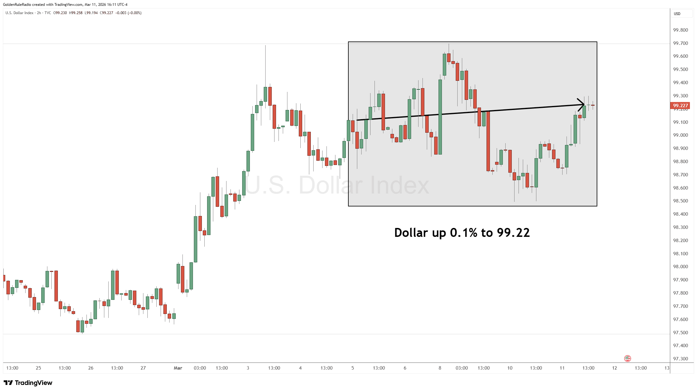 The US Dollar Index is up a staggering 0.1%, sitting at 99.22. At least short term, it's looking strong, but we'll want to see if that's true in the long term as well.
