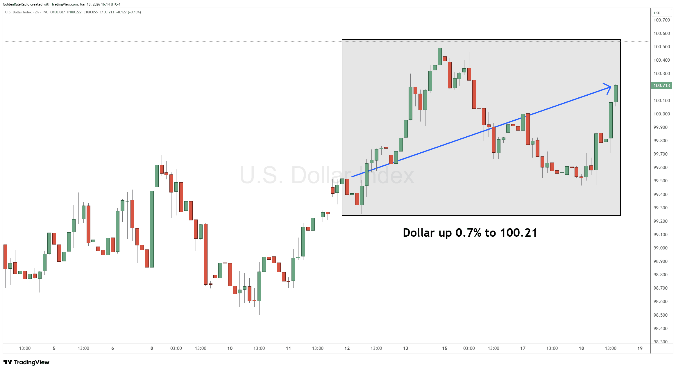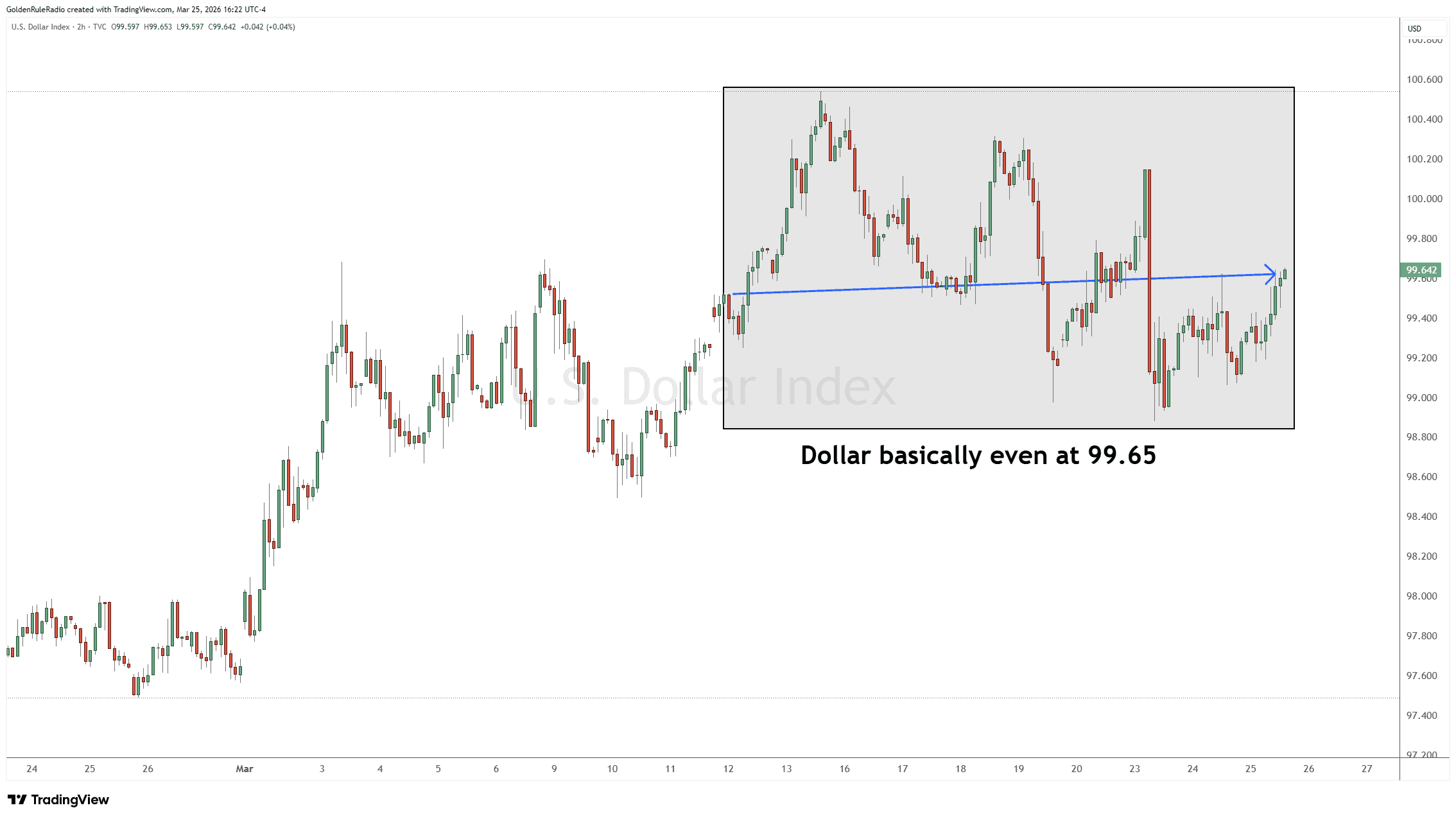 The US Dollar Index is flat, though trending upward, sitting at 99.65 from a week earlier.