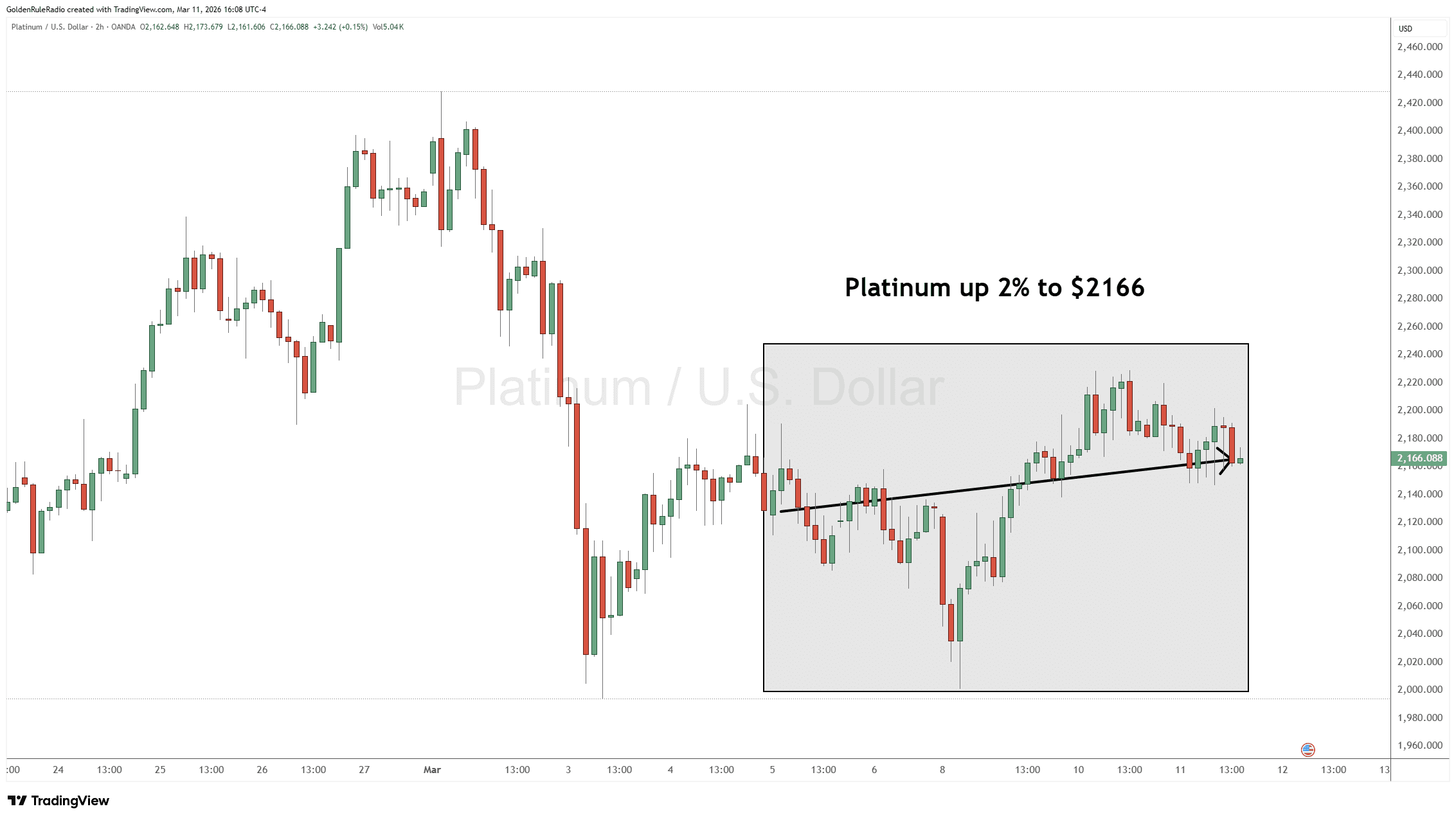 Platinum is up about 2% sitting at $2,166.