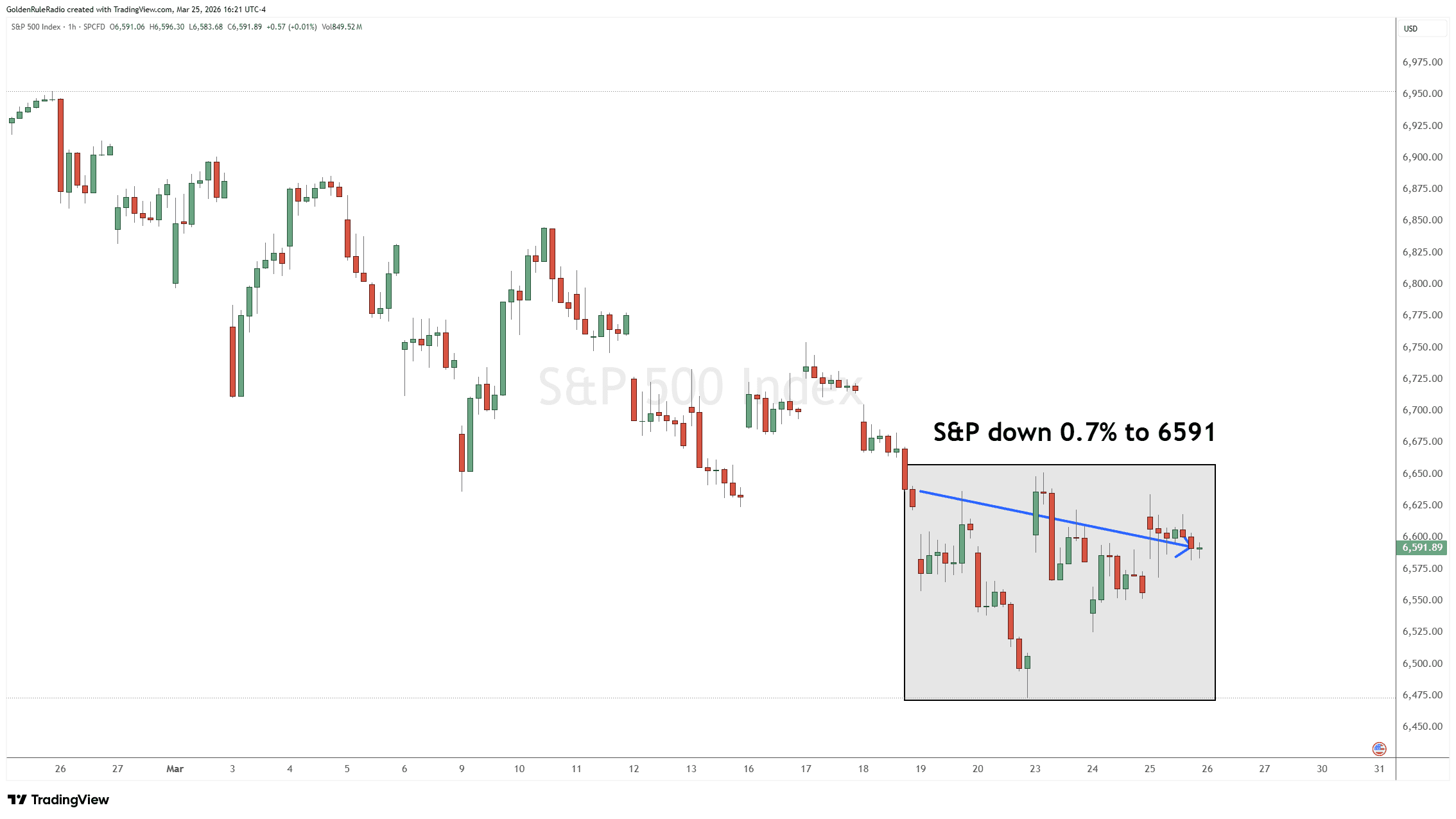 Taking a look over at the paper markets…The S&P 500 is down 0.7% to 6,591.