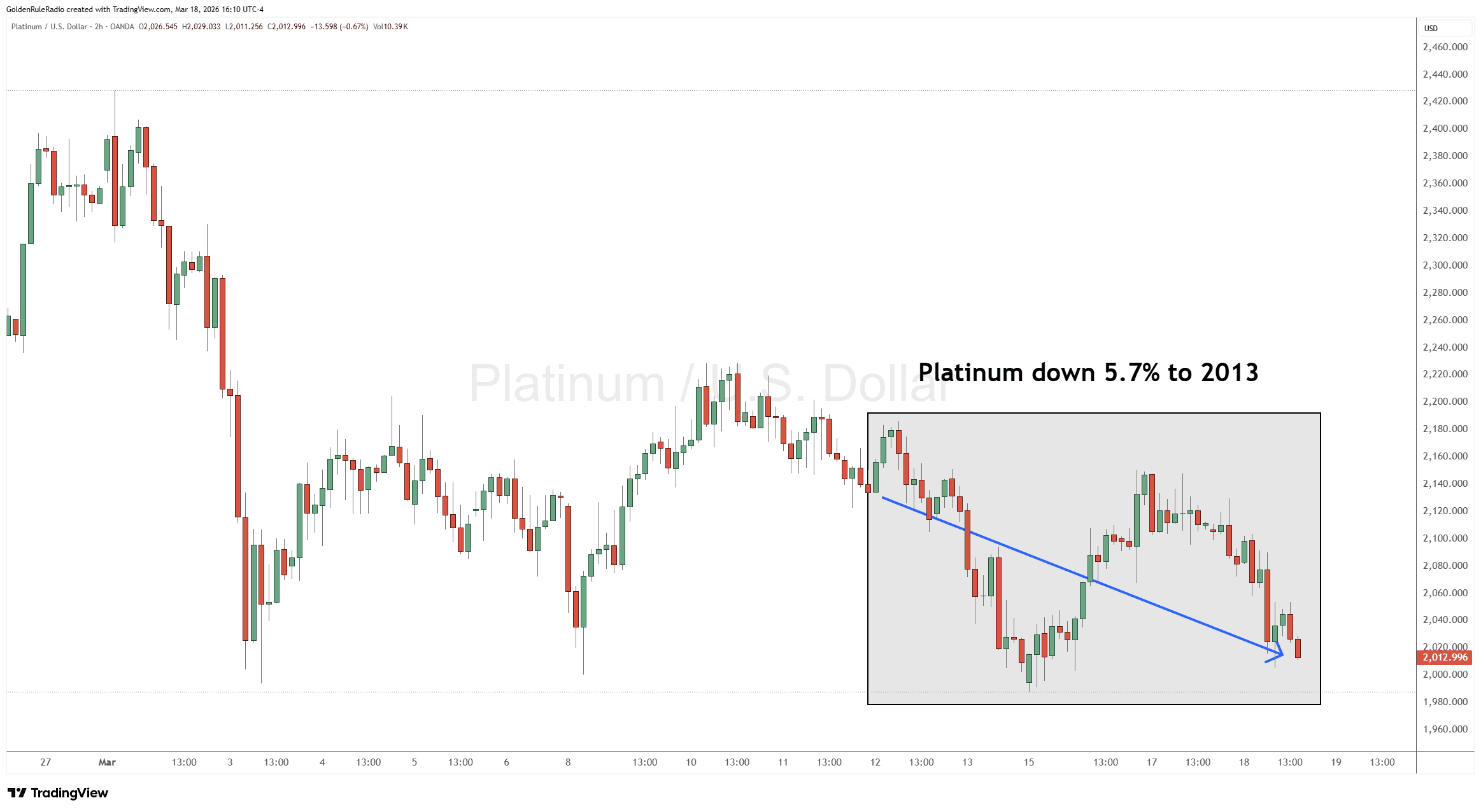 Platinum is down 5.7% sitting at $2,013.
