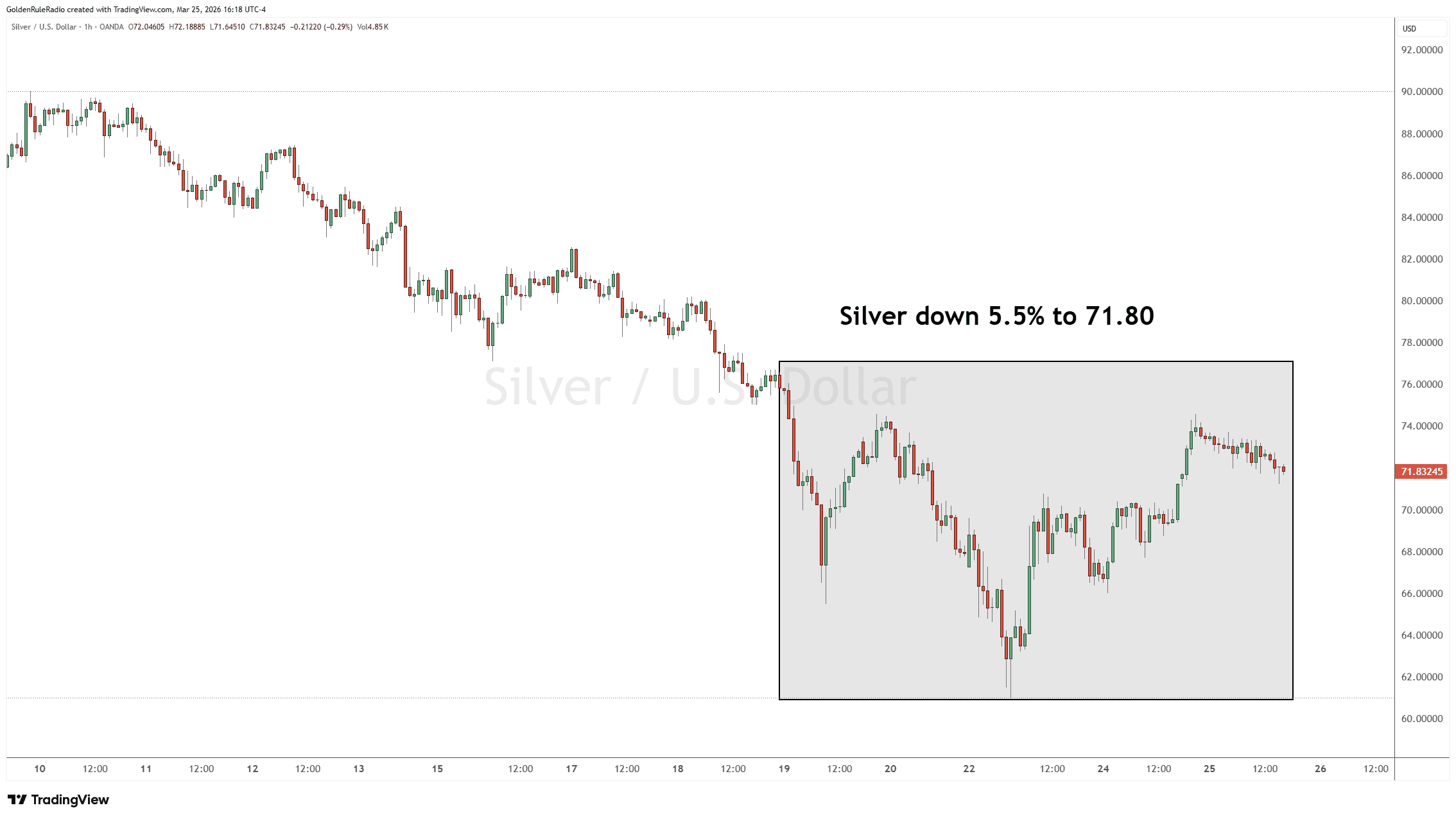 The price of silver is down 5.5%, sitting at $71.80.